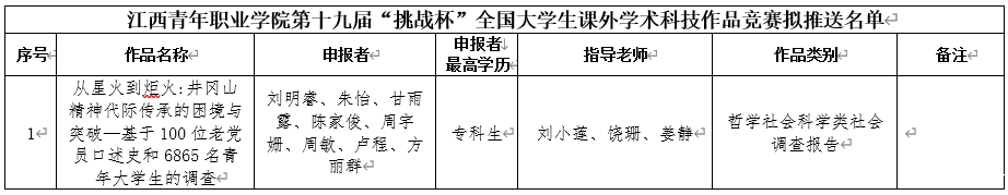 根据共青团中央、中国科协、教育部、中国社会科学院、全国学联联合下发的《关于开展第十九届“挑战杯”全国大学生课外学术科技作品竞赛的通知》工作安排,我校经省级竞赛选拔,获推1个国赛参赛名额。为切实做好国赛推荐工作,确保推荐工作的公平、公正、公开,现予以公示。