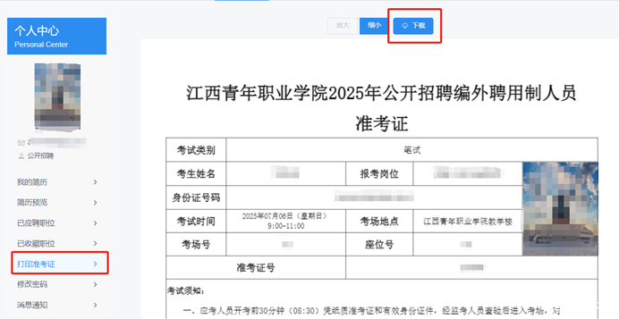(2)打印准考证方式:确认参加考试的考生登录taptap点点连接招聘网站(https://hjhr.jxqy.edu.cn/zp.html#/),点击个人中心-打印准考证-下载后打印。