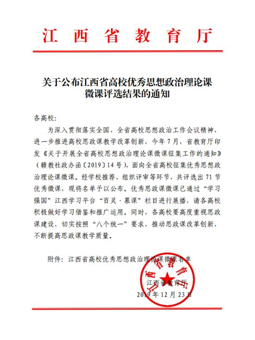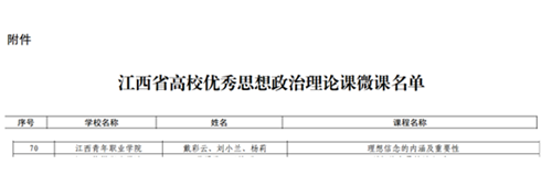 近日,从省教育厅传来消息,由我校教师戴彩云、刘小兰、杨莉制作的思想政治理论课微课,入选“全省优秀思想政治理论课微课”,并已经通过“学习强国”江西学习平台“百灵·慕课”栏目进行展播。