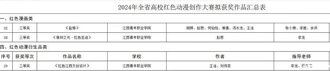 在“红色动漫”创作大赛中,我校报送作品《盐娘》《信仰之光·红色足迹》获红色动漫类三等奖;作品《红色江西文创设计》获红色动漫衍生品类三等奖。