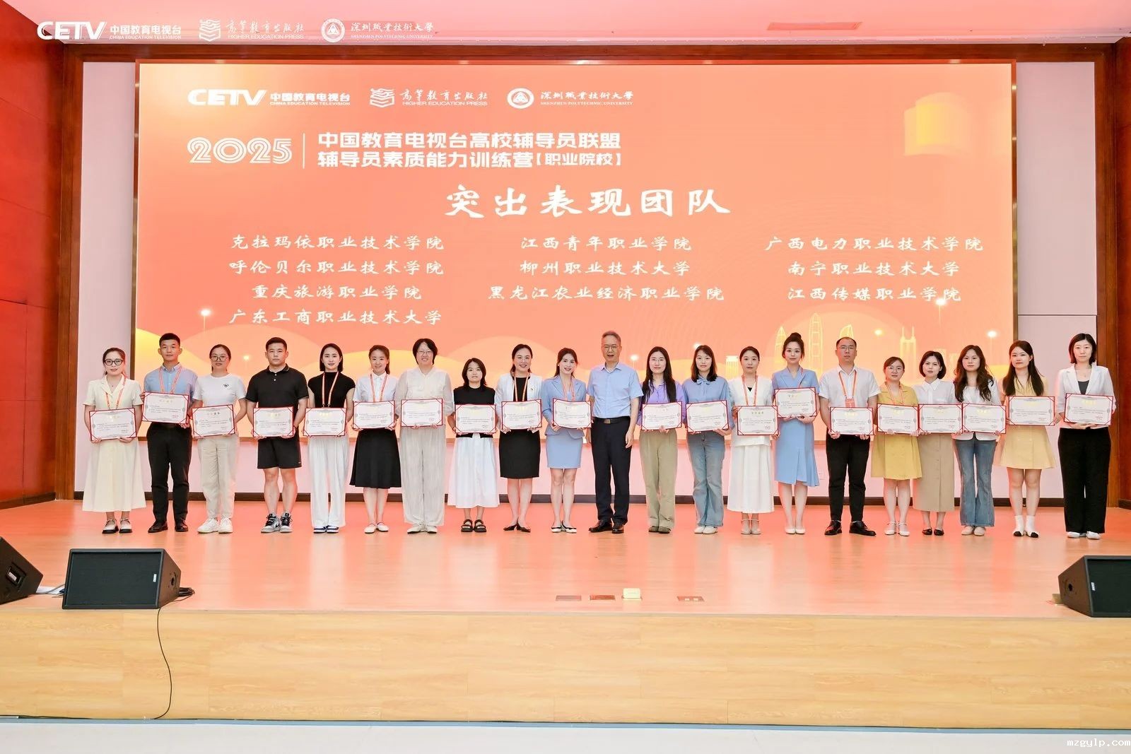 6月14日至16日,由中国教育电视台主办,高校辅导员联盟协办,深圳职业技术大学承办的2025年中国教育电视台高校辅导员联盟辅导员素质能力训练营(职业院校)顺利举行。本届训练营有全国30所职业院校的60余名辅导员参训。我校选派的由陈赟、李雅晨组成的辅导员代表队在比赛中脱颖而出,获“突出表现团队”。